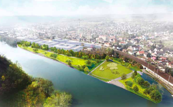 V plánu je znovu použít místní materiál, například kameny z břehů se využijí na dláždění a z recyklovaného betonu se vyrobí sedací prvky.
